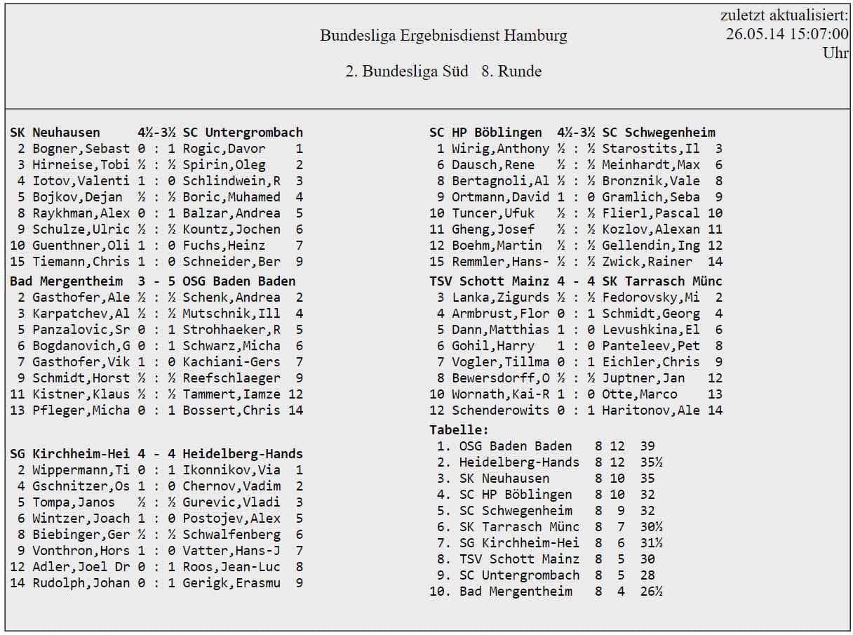 Runde 8: SC Böblingen – SC Schwegenheim 4,5:3,5 Spieltermin 15.03.2009 in Böblingen Partien zum Nachspielen Aufstellungen und Einzel-Ergebnisse aller Mannschaften