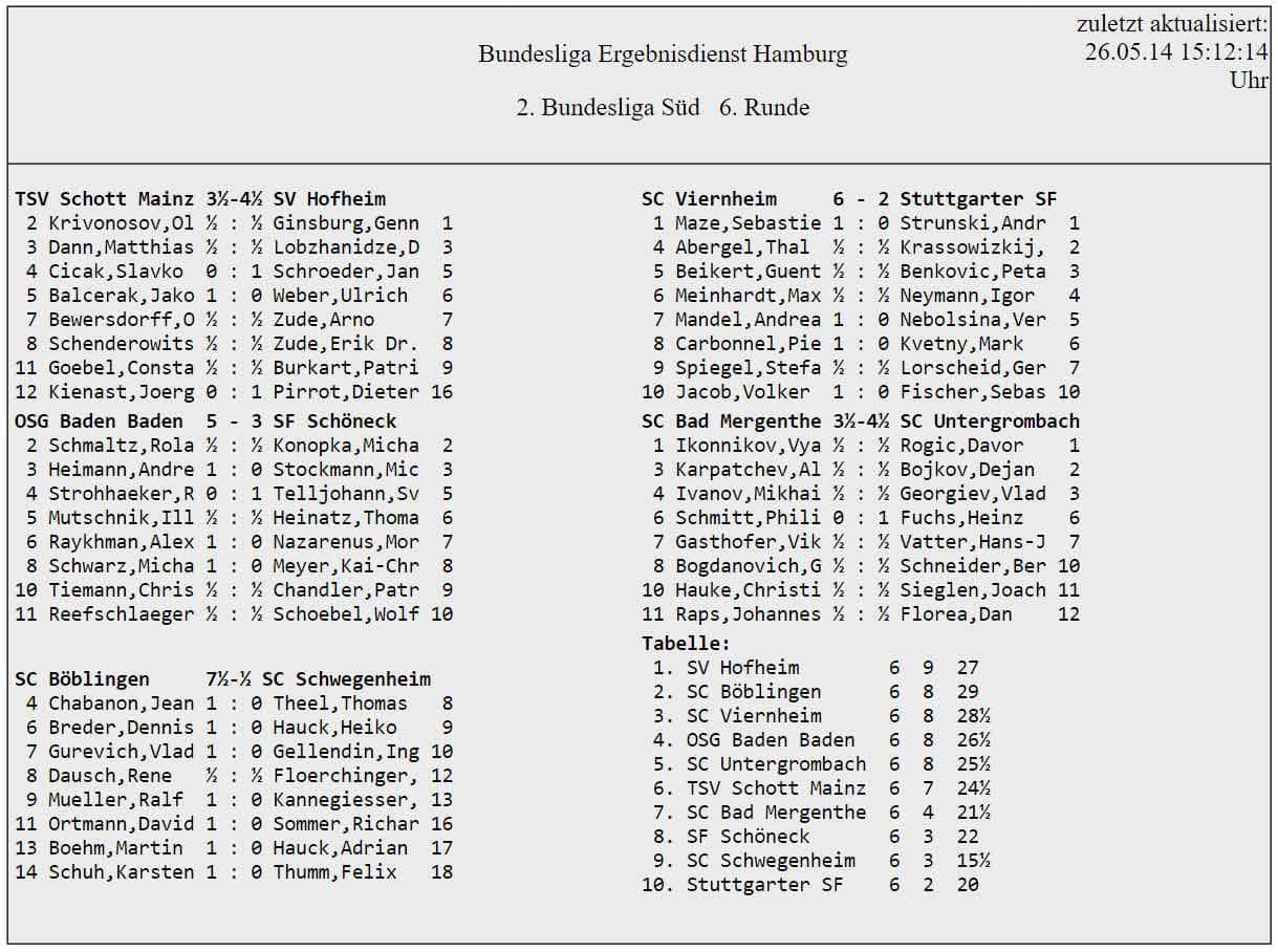 Runde 6: SC Böblingen – SC Schwegenheim 7,5 : 0,5 Spieltermin 03.02.2013 in Böblingen Partien zum Nachspielen Aufstellungen und Einzel-Ergebnisse aller Mannschaften