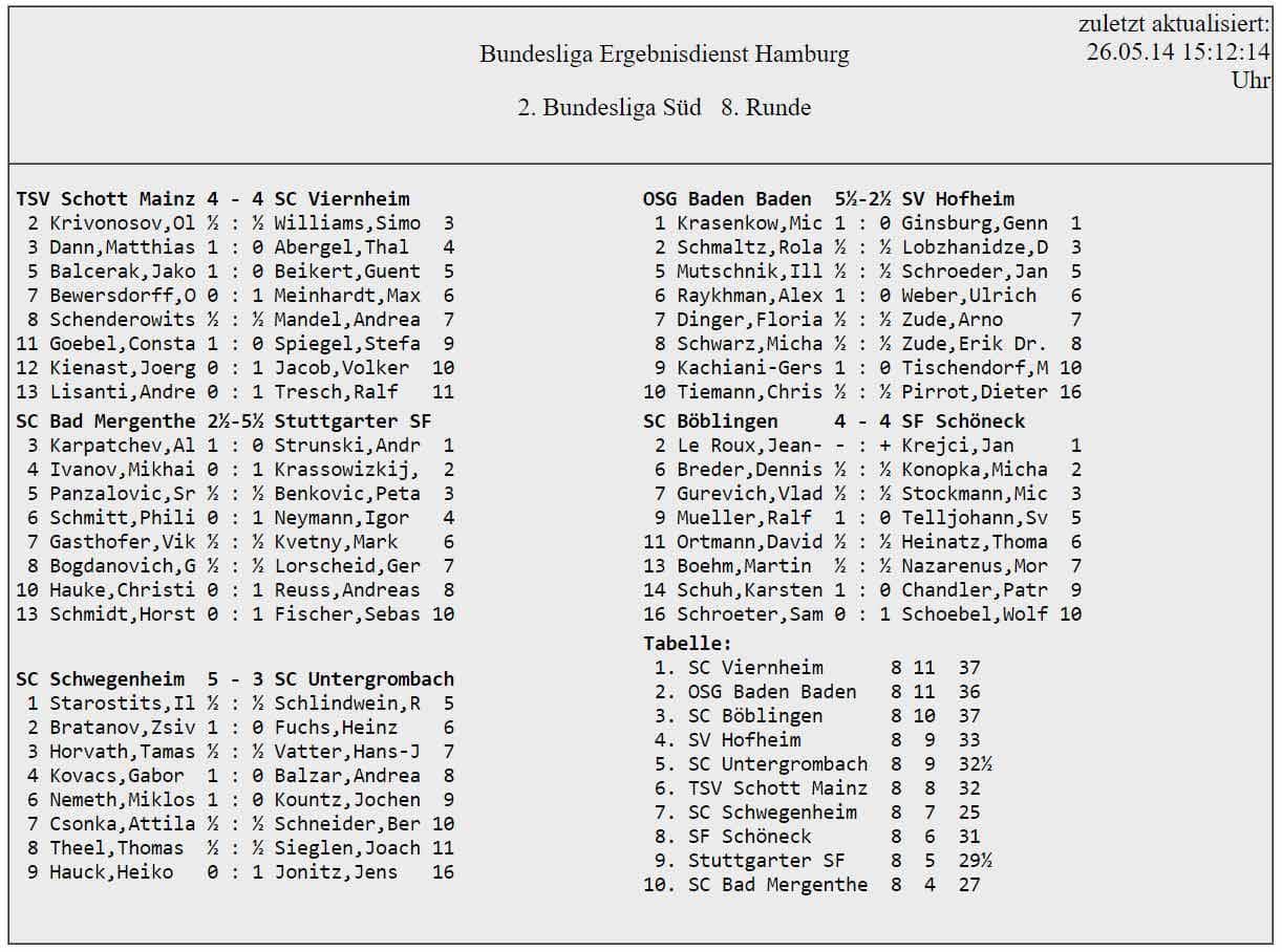 Runde 8: SC Böblingen – SF Schöneck 4 : 4 Spieltermin 17.03.2013 in Böblingen Partien zum Nachspielen Aufstellungen und Einzel-Ergebnisse aller Mannschaften