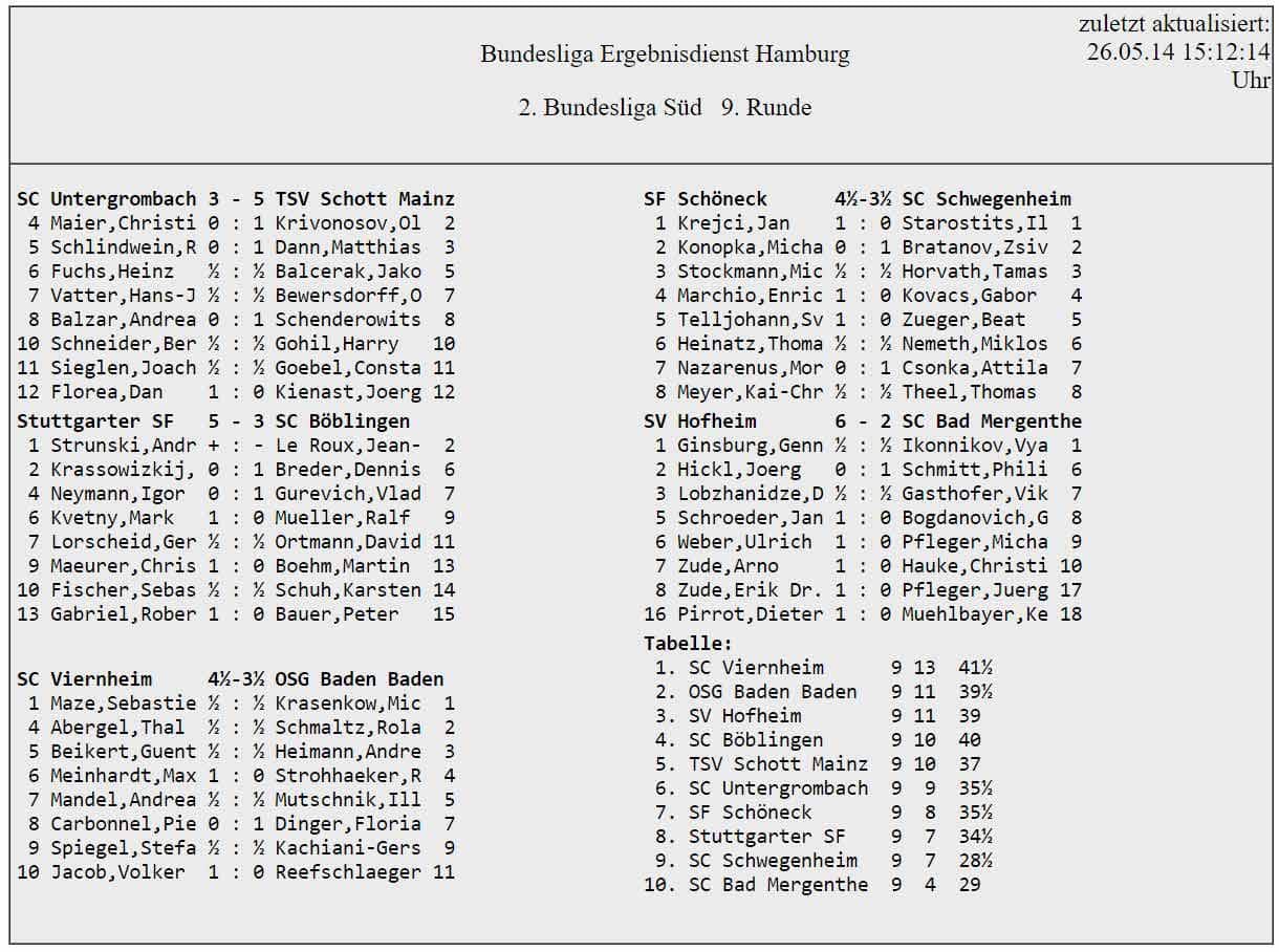 Runde 9: Stuttgarter SF – SC Böblingen 5 : 3 Spieltermin 14.04.2013 in Stuttgart Partien zum Nachspielen Aufstellungen und Einzel-Ergebnisse aller Mannschaften