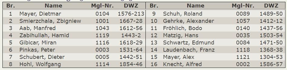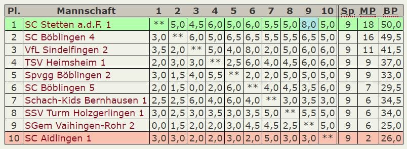 SC Böblingen 5 – Saison 2018-2019Endstand 6.Platz – Kreisklasse Abschluß-Tabelle 5.Mannschaft – Kreisklasse-2018-2019 Aufstellung-Tabelle 5.Mannschaft – Kreisklasse-2018-2019 Tabelle Aufstellungen Einzelergebnisse Topscorer Terminübersicht - - - - Archiv